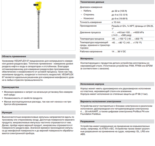 Область застосування Рівнемір VEGAFLEX 67 зі стрижневим або тросовим зондом призначений для безперервного вимірювання міжфазного рівня.